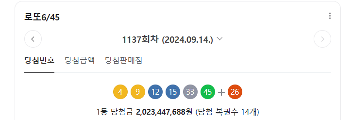 | 로또 1137회 당첨번호 알려드립니다 (6) | 2024.09.08 |