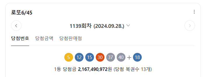 | 로또 1139회 당첨번호 알려드립니다 (10) | 2024.09.22 |