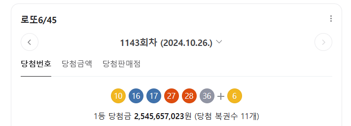 | 로또 1141회 당첨번호 알려드립니다 (8) | 2024.10.06 |