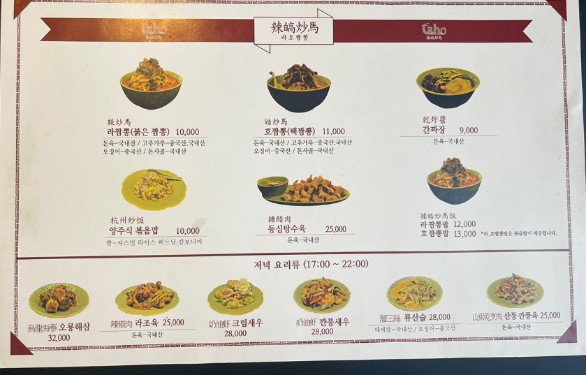 메뉴는 라짬뽕과 호짬뽕 그리고 간짜장, 볶음밥, 등심탕수육등 라호짬뽕만의 시그니처 메뉴들이 있었습니다.