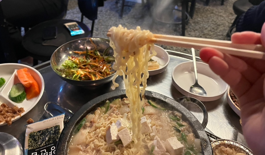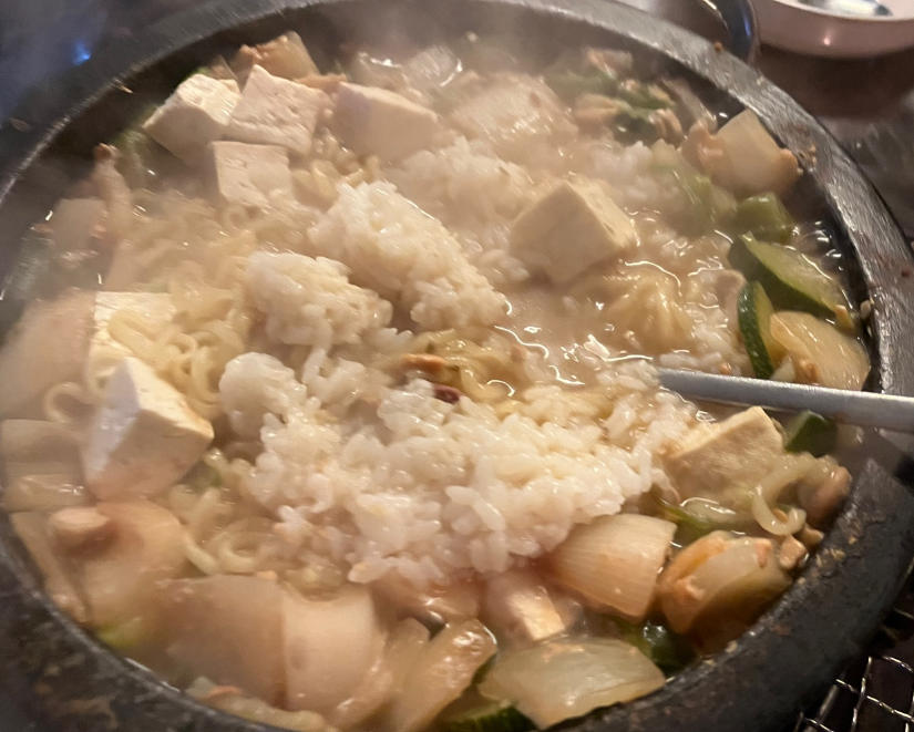 거기에 추가로 돌된장찌개까지 딱 먹었네요. 양이 정말 푸짐하죠? 여기에 사리랑 밥을 안 넣을 수 없으니 바로 추가해 버렸습니다. 오늘 둘이서 너무 많이 먹는 거 아닌가 몰라요.