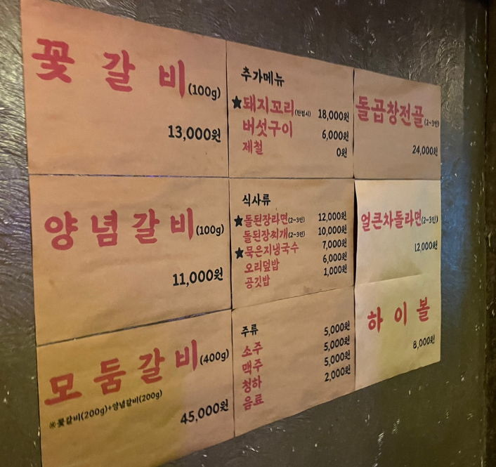 메뉴는 꽃갈비부터 양념갈비 모둠갈비까지 다양하고 돼지꼬리구이도 있는점은 정말 신기했네요. 식사류도 많아서 좋았습니다.