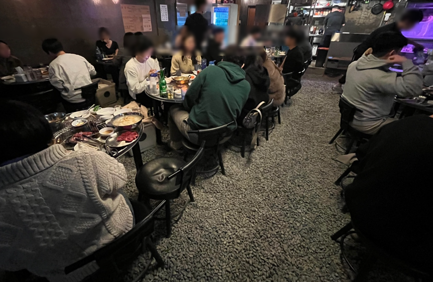 가게 안의 갬성입니다. 정말 멋있죠? 자갈느낌을 구성된 자리에 다닥다닥 손님들이 붙어 앉아 있네요. 저 역시도 저 손님 중 한 명이 되기 위해 열심히 기다렸습니다. 웨이팅이 저녁에는 거의 무조건 있다고 보셔야 합니다.