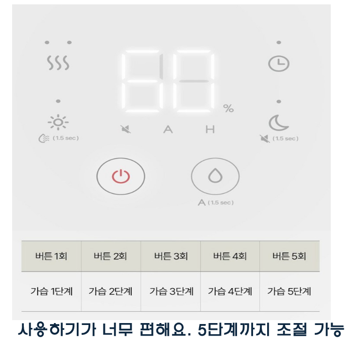 분무량은 1~5단까지 조절되는데, 5단은 확실히 대용량다운 출력이라 공기 중에 빠르게 습기가 퍼지는 게 느껴질 정도였어요.