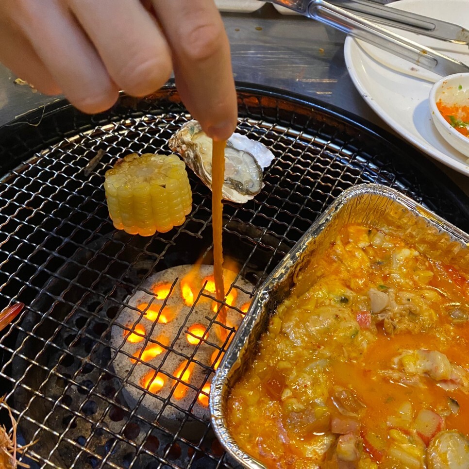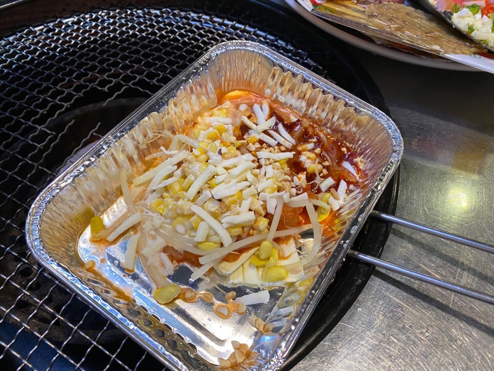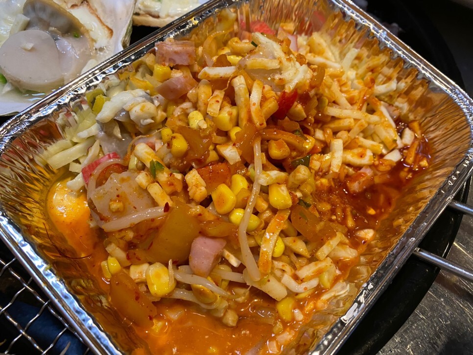 토핑이 익자마자 은박지에 넣어서 비빈 후 조개와 먹었는데