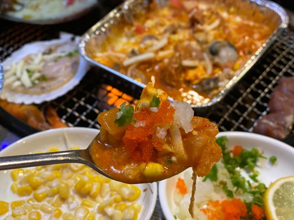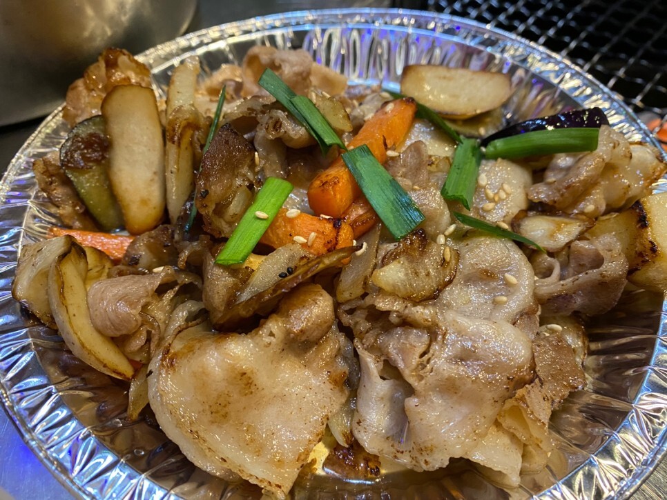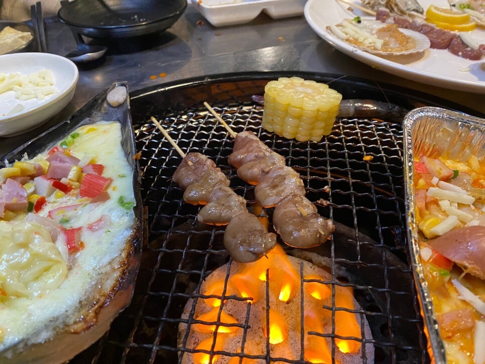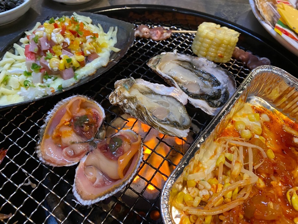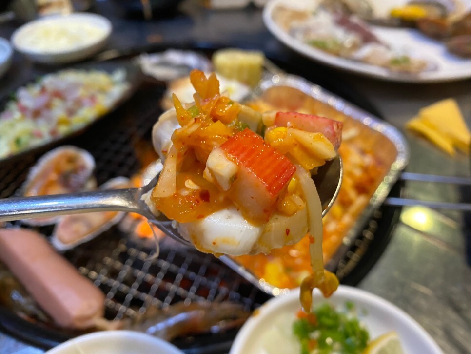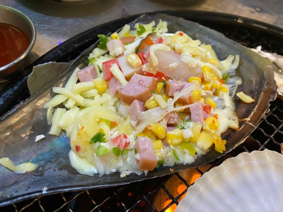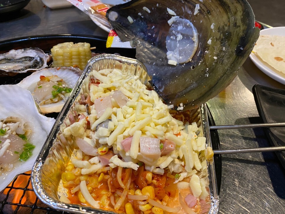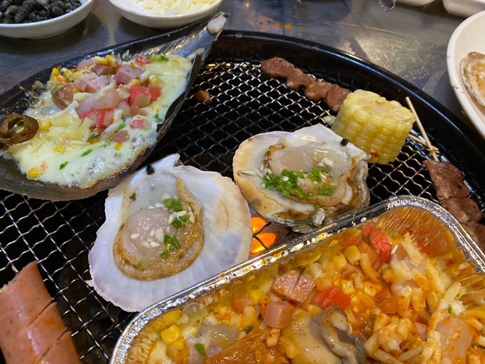 조개구이가 없어 보이지만 염통과 소시지 등의 밑에 다 깔려있답니다.